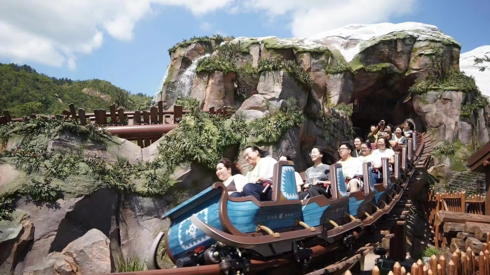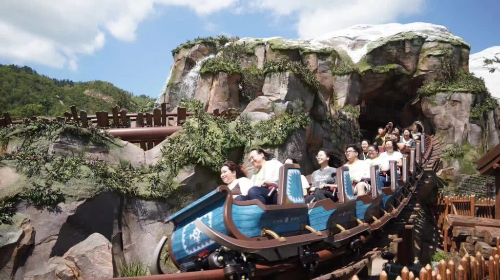 魔雪奇幻之旅是園區頭號必玩設施,也是最長排隊時間的項目。遊客乘船穿越艾倫戴爾王國,沿途重現電影經典情節,包括安娜與艾莎的童年時光、冰雪皇宮場景等。最後一幕艾莎在冰雪皇宮高唱《Let It Go》,船隻會無預警向後倒退向下衝,激起水花,驚喜十足。這項設施的排隊時間經常超過60分鐘,建議入園後第一時間衝去排隊,或者購買提早入園證及尊享卡,節省等待時間。